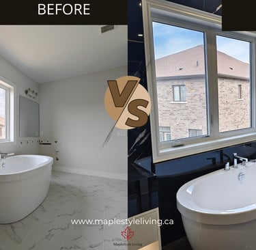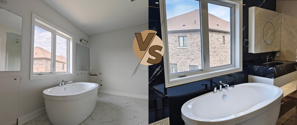 Located in the Greater Toronto Area, this project involved the complete overhaul of a standard, developer-grade bathroom. The original space featured generic light-colored tiling with a fragmented visual focus. The transformation reclaims the space as a high-contrast, minimalist spa environment, replacing mediocrity with bespoke execution.