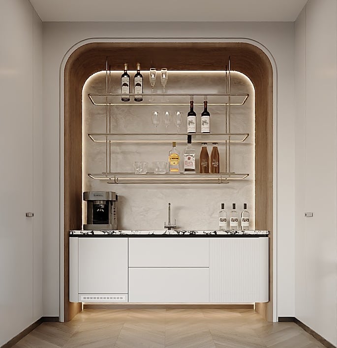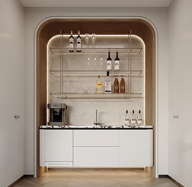 Kitchens, wardrobes, wall systems, built-in elements, and architectural surfaces are developed as a unified spatial system.